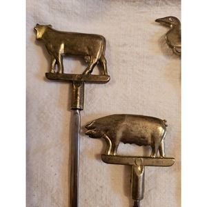 I did not see any marks of identification on any of these four pieces. These items are often portrayed as being barbecue skewers; however, they could also be used for marking meat cuts. Each piece is approximately 13 in Long including the brass animal at the top. Please review each photograph provided as our pictures are always an important part of our descriptions.