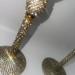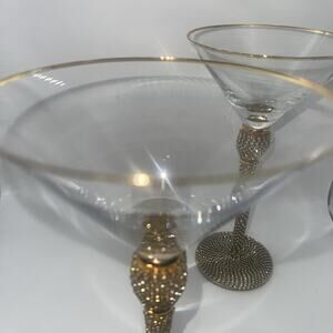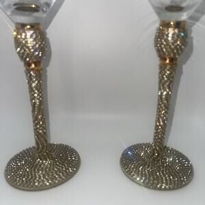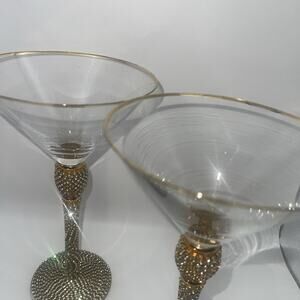 The product is a set of 8-3/4" martini glasses adorned with rhinestones in gold. These elegant goblet glasses are made of clear glass and are perfect for serving cocktails or other beverages in style. The intricate design and sparkling rhinestones add a touch of glamour to any barware collection, making them a sophisticated addition to your home or dining area. Perfect for entertaining guests or enjoying a relaxing drink at home, these martini glasses are sure to impress with their luxurious appearance. 2 stones missing off one of the glasses but not very noticeable see pic.