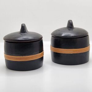 Add a touch of rustic charm to your home decor with this set of small black canisters. Perfect for storing salt or other small items, these antique-style ceramic jars are sure to add character to any room. Use them on your counter tops or as shelf decor. They have a clay or ceramic feel to them with a band of earthy materia around the middle. Measuring 2.75 inches in height, these earthy jars are ideal for multipurpose use. The black color and primitive design make them a great addition to any home decor theme. They are in very good condition with some minimal normal vintage wear. Add them to your home today!