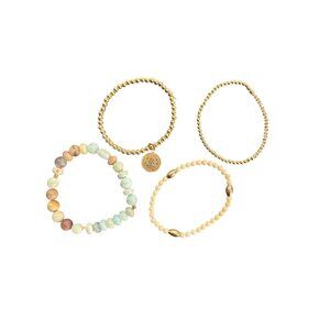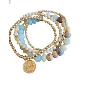 These semi-precious gemstone and gold beaded bracelets bring a bohemian flair to any jewelry collection. The set includes four distinct bracelets, each featuring a unique combination of colorful gemstones and gold beads. Perfect for stacking, they add a versatile touch of elegance to your accessory wardrobe with their charming coin detail.