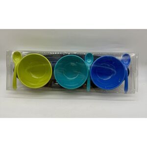 This is a set of three acrylic bowls with matching spoons and a serving tray. The bowls are solid in pattern and come in multicolor. The set includes round bowls and an oval tray, making it suitable for all occasions. Made from acrylic material, this unbranded set is perfect for serving a variety of dishes in a stylish and vibrant way.