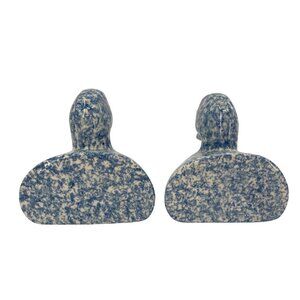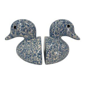 Set Of Two Blue & White Ceramic Duck Bookends With Felt Bottoms Sponge paint