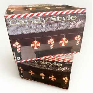 The product is a set of two boxes of Candy Style String Candies & Candy Cane Lights by the brand Candy. These large string lights are made of cane material and are designed to provide a festive and decorative lighting display, perfect for holiday and seasonal celebrations. The sensor type for these lights is light, ensuring they are activated automatically when introduced to light. Each box likely contains a long strand of lights shaped like candy canes, adding a whimsical touch to any space.
