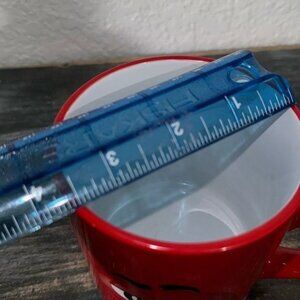 Green mug has a small scratch on the face. Green mug: 4 inches tall; Red mug: 3.5 inches tall.