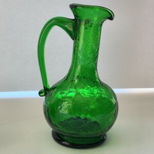 These are Rainbow #213 Green Crackle Glass Pitchers, likely from the mid-20th century. It is characterized by its vibrant green color, crackled glass texture, and hand-blown construction. The pitcher also features a clear applied handle and a pontil mark on the base, which are common in hand-blown glass items.