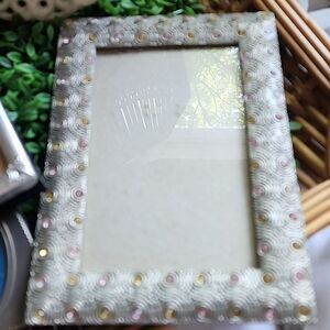 Rectangular weighted silver tone intertwined circles, pink, yellow rhinestones