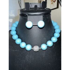 Set Turquoise Colored Lucite Bead Necklace Earrings Rhinestone Bead Closure