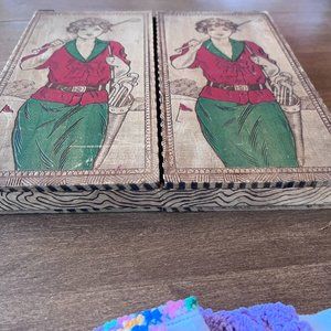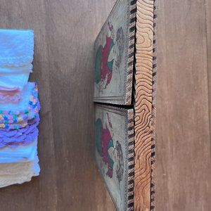 Set Victorian Wooden Pyrography box Keepsake box Woman Golf VTG handkerchiefs