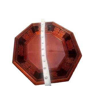 Set Vintage Asian Red Hand Carved Wooden Lacquerware Octagonal Decorative Tray