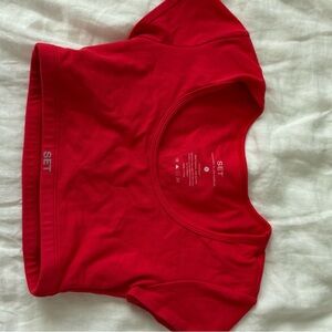Stylish red crop top and leggings set. Perfect for workouts or casual wear.