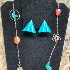 Necklace, charm bracelet, a pair of hoop earrings and triangular pierced earrings. all for $30. Fun summer colors