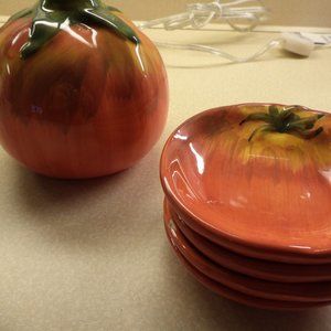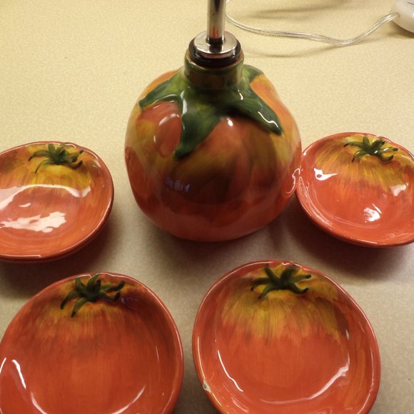 Set includes Bottle for Dipping Oil and Matching Serving Saucers.- Tomato Design