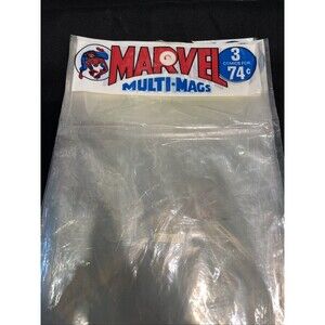 This set of 10 rare vintage 1970s Marvel multi-mags clear bags holds 3 comics each bag. The bags are specifically designed for US MARVEL comics from the Bronze Age era, featuring characters from the Marvel universe. Made by Marvel Comics in the 1970s, these multi-mag bags are a unique and collectible item for comic book enthusiasts. With a unit price of just $0.74, this set offers a great way to preserve and protect your comic book collection. These bags are like new but do have some colored markers on a few of bags but otherwise in great condition.