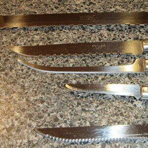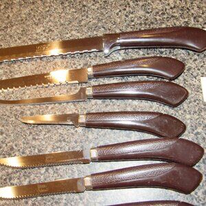 Set of 10 Vintage Ginsu Stainless Serrated Knife Knives USA Brown Handle, Steak knives, bread knives, etc. Please see pictures for the items you will receive.