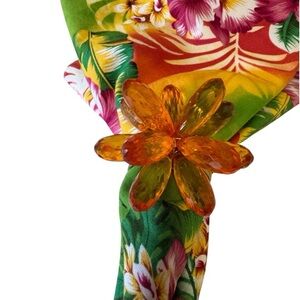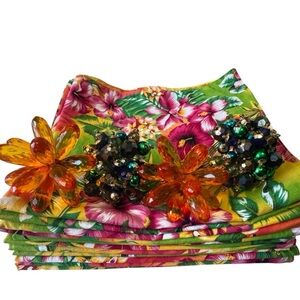 Set of 12 vibrant tropical 16” square napkins and 10 beaded napkin rings