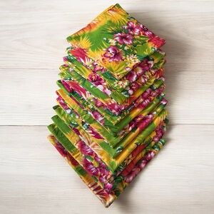 Set of 12 tropical napkins. 16”ish square, double thickness napkins. Tropical colors on one side, lined with vibrant yellow contrast fabric. No labels but nice weight and quality, appear to be cotton. These come out of the dryer flat and ready to use…don’t curl up and no need to iron! 😊
