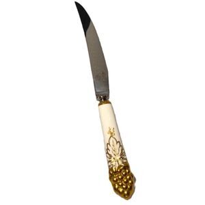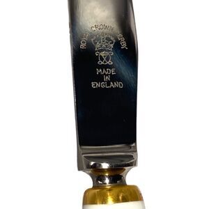 Indulge in opulence with this exquisite set of 13 Royal Crown Derby Vine Gold steak knives. Crafted with utmost precision, these knives boast Bone China handles adorned with a delicate vine pattern in luxurious gold accents. Elevate your dining experience and impress your guests with the unmatched elegance and timeless charm of these regal steak knives. Perfect for special occasions or adding a touch of sophistication to everyday meals. Experience the pinnacle of dining luxury with this remarkable set from Royal Crown Derby.