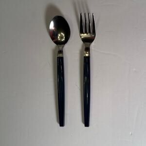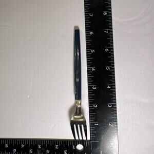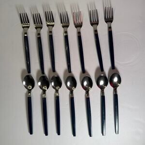 This set of 14 vintage mid-century modern stainless china silverware with blue plastic handles is perfect for both adults and kids. The set includes 6" forks and spoons, making it ideal for everyday use. The solid blue handles add a fun pop of color to your table setting, while the durable plastic handle material ensures easy cleaning and long-lasting use. With a service for 7, this set is both practical and stylish for any home or dining establishment.