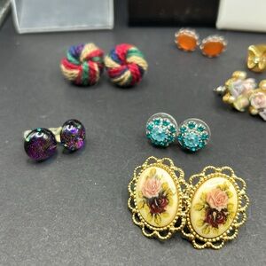 Vintage earrings in all colors, shapes, and sizes. 16 pair of post style earrings. Includes new blue case. Case is about 8” x 6” x 2”.