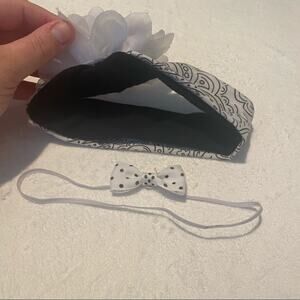 Set of 2 baby girl elastic headbands. One has a wide band with large white flower & paisley print. One is a small elastic headband with white and black polka dot bow. Both are in good used condition with no flaws or stains other than some minor wash wear. Please see close-up pictures for condition details.
