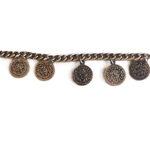 Short (20") necklace has dangling coins, adjustable length, and lobster clasp