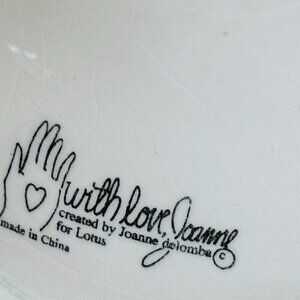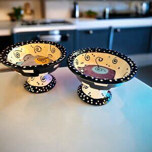 Set of 2 funky bowls on pedestals. They are from the collection For Lotus by With Love by Joanne. The polka dots and swirls are raised so they give a nice textured look. Each bowl is attached to small pedestal so they also would make pretty cute candy/trinket dishes if desired. The bowl on the inside shows a purple coffee cup. Approximately 6.5" in diameter and 4" tall including attached pedestal.