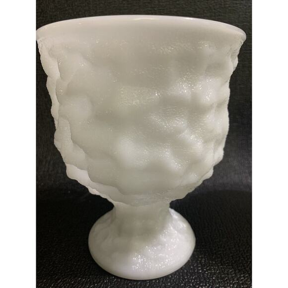 These vintage milk glass vases from E O Brody Co features a unique crinkled pedestal design that adds a retro touch to any decor. The opaque glass production style creates a timeless look that is sure to impress guests. The vase is in great shape and perfect for displaying flowers or other decorative items.