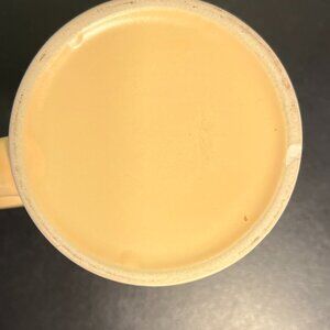 Mug 1) features a wraparound design of a bevy of boats on stylized two toned blue waves against a creamy white matte finish exterior. Blue and orange cursive text reads, Puerto Montt, Chile. Burnt red interior. There is a small chip on the outer edge of the underside. See photos.