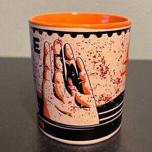 Mug 2) features a striking wraparound matte finish design in creamy white, black, burnt orange and burnt red with the palm of a hand and an abstract full sun design. Black and Orange text reads, CHILE ll Region. (Chile Los Lagos Region.) Burnt orange interior. .