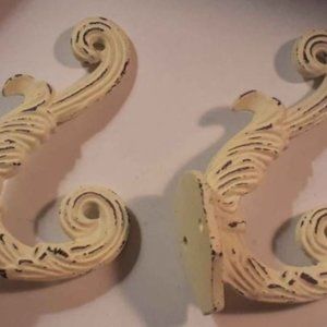 et of 2, Cast Iron Victorian Distressed Milky Antique White Wall Hooks