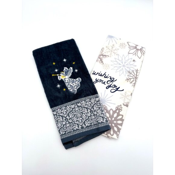 Pretty, cozy holiday towel set by St Nicholas Square with two coordinating looks: one features a festive embroidered angel, and the other has a winter print with an embroidered “wishing you joy” message. Great for seasonal kitchen décor or gifting.