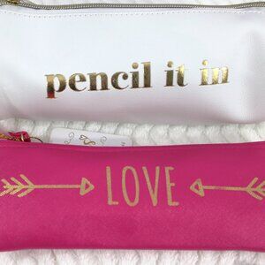 Stay organized in style with this set of two chic faux leather pouches — one bright pink with LOVE and gold arrows, and one white with pencil it in printed in metallic gold. Perfect for use as a pencil case, makeup pouch, or travel organizer.