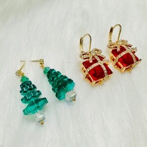 Set of 2 Crystal Christmas Tree & Bow Present Earrings Emerald Holiday Jewelry