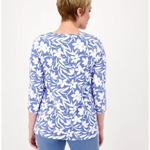 Includes one printed V-neck top with 3/4-length sleeves and one solid boat-neck top with ballet sleeves