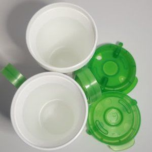 Set of 2 Disney Parks Rapid Refill Travel Mugs Green lid and handle with Mickey, Minnie, Pluto, and Daisy Duck. Nice set of plastic mugs measure approx 6.5" tall