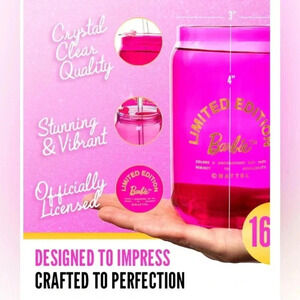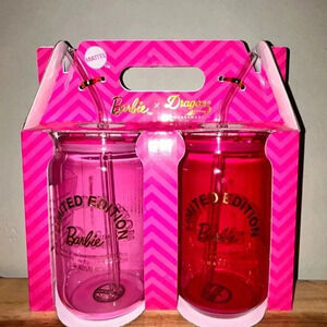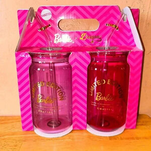 Unique Limited Edition drinking glasses from The Barbie Collection by Mattel. Barbie x Dragons glasses are amazing. One light pink cup. 1 dark pink cup. Gold lettering. Each cup can hold 16oz.Sturdy cups with lid and straw. Special device on the straw allows these cups to be turned into sippy cups in a matter of seconds. High quality lead free crystal.Signature Barbie Branding. Mattel product. Trendy, boxy look. These are a really fun! They are very unique and will bring the best pop of color and energy to your home.brand new with tags.