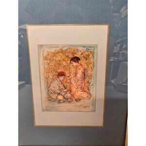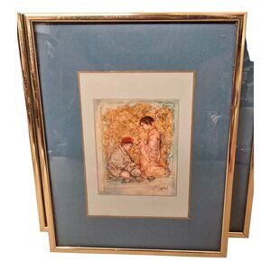 Set of 2 Edna Hibel Prints Gold Framed & Blue Matted Art