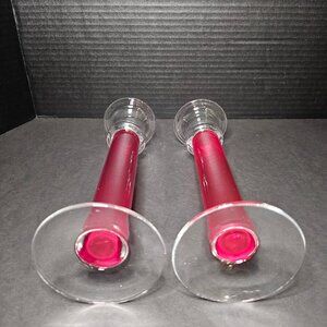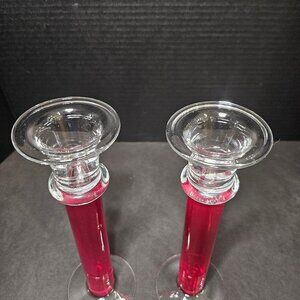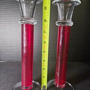 Set of 2 Elegant Crate and Barrel Ruby Red and Clear Tall Glass Candlestick Hold