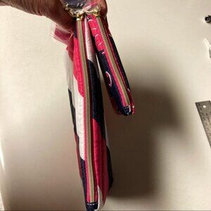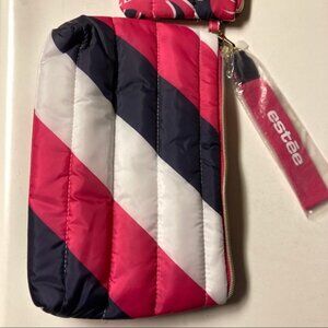 Multi colored, brand new, set of matching Estee Lauder Cosmetic bags. Pink, navy & white pattern from the “floating on air” collection