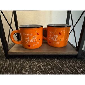 Bring cozy autumn vibes to your mornings with this festive set of 2 mugs! Each bright orange mug features a black rim and charming fall leaf details with the phrase “Happy Fall Y’all” in white script. Perfect for sipping coffee, tea, or hot cocoa during crisp fall days.