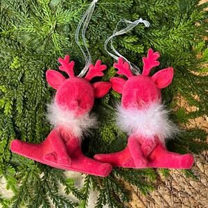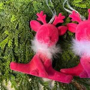 Set of 2 Flocked Pink Deer Reindeer Christmas Ornaments Sleeping Faux Fur Boa