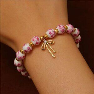 Add a touch of timeless elegance to your jewelry collection with this set of two ceramic bead bracelets, featuring hand-painted floral patterns in soft pink and blue colorways. Each bracelet is beautifully finished with a gold-toned bow charm, adding a dainty and feminine touch to your wrist.