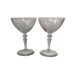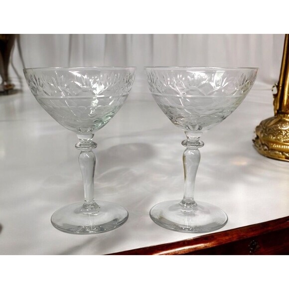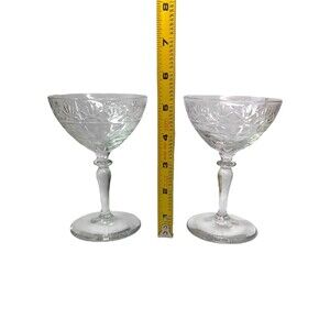 Set of 2 Floral Etched Art Deco Crystal Cut Glass Cocktail Cordial Glasses