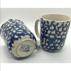 Tienshan Hearts Folk Craft Blue Sponge Design Stoneware Coffee Mugs Cups