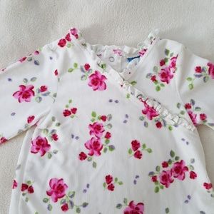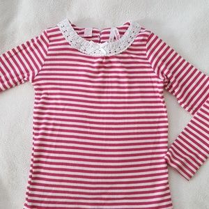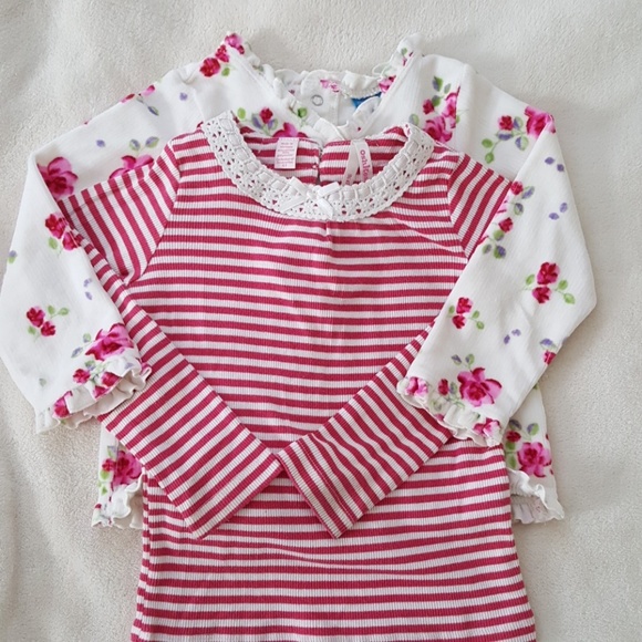 This is a pair of girls tops in very good condition. The first is a floral velour top in a faux wrap style and ruffle trim. From Childrens Place. The second is a ribbed top from Osh Kosh, with pink stripes, crochet trim and a bow. Girls size 4T.