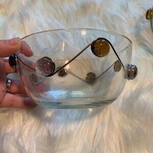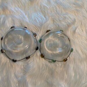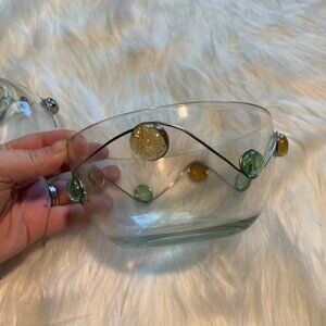 Great condition. Set of 2 Glass bowls. One has different shades of purple dots and one has various shades of blue, green and yellow. Both have silver accents. Smoke free home. No trades, offers welcome.