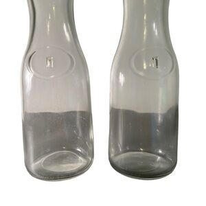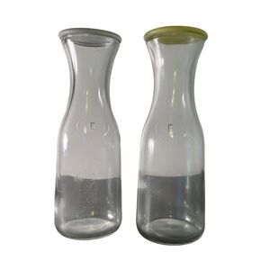 Great condition, minor wear. Set of 2 Glass Carafes with Lids. 1/2 liter, 32oz each. One has yellow lid, other has white.