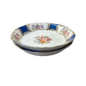 Set of 2 Old Gold Castle Japan GCA-2 Soup Bowls Plates Blue Rim Floral Design Scrolls