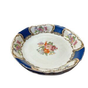 Set of 2 Gold Castle Japan GCA-2 Soup Bowls Plates Blue Rim Floral Design Scroll