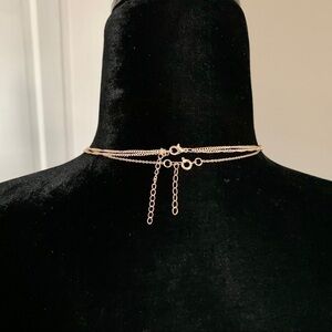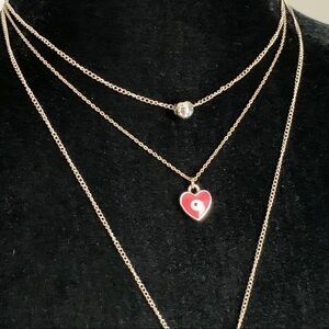 Really fun gold tone layering necklaces. These are not real gold! Both are brand new never worn. The heart necklace has a watching eye in it. Look beautiful worn alone or together. Heart necklace measures 16-17” long with adjustable clasp and the charm is 1/2” tall. The layered necklace measures 14” around shortest layer, 20” around longest layer, and can be adjusted up to 2” longer with adjustable clasp. Bar charm at the bottom falls 6” from the V.